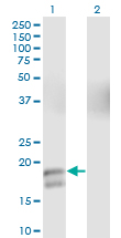 Western Blot analysis of GCG expression in transfected 293T cell line by GCG monoclonal antibody (M01), clone 2D3-2B11. Lane 1: GCG transfected lysate(20.9 KDa). Lane 2: Non-transfected lysate.
