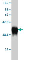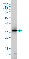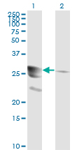 Western Blot analysis of GCH1 expression in transfected 293T cell line by GCH1 monoclonal antibody (M01), clone 4A12. Lane 1: GCH1 transfected lysate(27.9 KDa). Lane 2: Non-transfected lysate. |