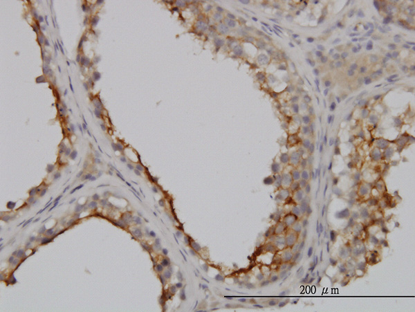 Immunoperoxidase of monoclonal antibody to GGT1 on formalin-fixed paraffin-embedded human testis. [antibody concentration 3 ug/ml] |
