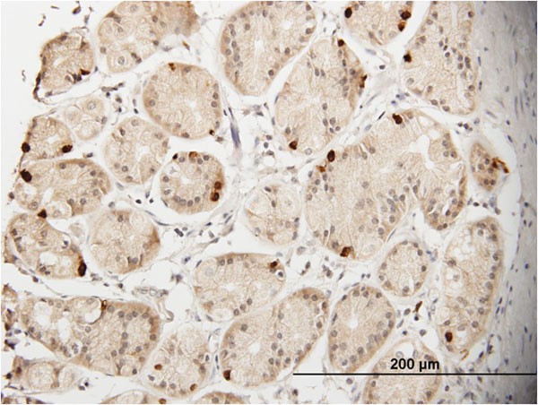 Immunoperoxidase of monoclonal antibody to GHRL on formalin-fixed paraffin-embedded human stomach. [antibody concentration 1.5 ug/ml] |