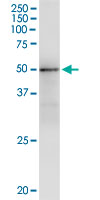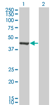 Western Blot analysis of GMPPA expression in transfected 293T cell line by GMPPA monoclonal antibody (M01), clone 2F1. Lane 1: GMPPA transfected lysate(46.291 KDa). Lane 2: Non-transfected lysate.