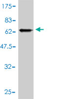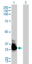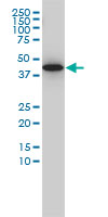 Western Blot analysis of GNA13 expression in transfected 293T cell line by GNA13 monoclonal antibody (M01), clone 6F6-B5. Lane 1: GNA13 transfected lysate(44 KDa). Lane 2: Non-transfected lysate. |