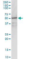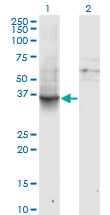 Western Blot analysis of GNAI1 expression in transfected 293T cell line by GNAI1 monoclonal antibody (M01), clone 2B8-2A5. Lane 1: GNAI1 transfected lysate(40.4 KDa). Lane 2: Non-transfected lysate. |