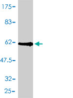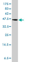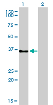 Western Blot analysis of GPR3 expression in transfected 293T cell line by GPR3 monoclonal antibody (M01), clone 3B4-G3. Lane 1: GPR3 transfected lysate(35 KDa). Lane 2: Non-transfected lysate. |