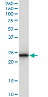 Western Blot analysis of GSTA1 expression in transfected 293T cell line by GSTA1 monoclonal antibody (M08), clone 1F9. Lane 1: GSTA1 transfected lysate(26 KDa). Lane 2: Non-transfected lysate. |