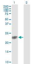 Western Blot analysis of GSTP1 expression in transfected 293T cell line by GSTP1 monoclonal antibody (M01), clone 2G6-F6. Lane 1: GSTP1 transfected lysate (Predicted MW: 23.3 KDa). Lane 2: Non-transfected lysate.