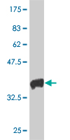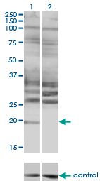 Western Blot analysis of HAND2 expression in transfected 293T cell line by HAND2 monoclonal antibody (M06), clone 3D5. Lane 1: HAND2 transfected lysate(21.6 KDa). Lane 2: Non-transfected lysate.