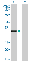 Western Blot analysis of HAX1 expression in transfected 293T cell line by HAX1 monoclonal antibody (M04), clone 1D2. Lane 1: HAX1 transfected lysate(31.6 KDa). Lane 2: Non-transfected lysate.