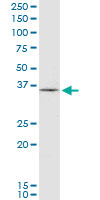 Western Blot analysis of HHEX expression in transfected 293T cell line by HHEX monoclonal antibody (M02), clone 1A5. Lane 1: HHEX transfected lysate (Predicted MW: 30 KDa). Lane 2: Non-transfected lysate. |
