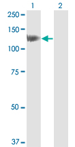 Western Blot analysis of HIP1 expression in transfected 293T cell line by HIP1 monoclonal antibody (M01), clone 1F12. Lane 1: HIP1 transfected lysate(116.2 KDa). Lane 2: Non-transfected lysate. |