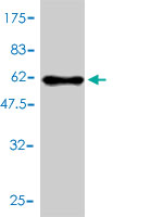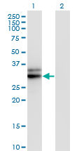 Western Blot analysis of HMGCL expression in transfected 293T cell line by HMGCL monoclonal antibody (M01), clone 4F4-D1. Lane 1: HMGCL transfected lysate(34.4 KDa). Lane 2: Non-transfected lysate. |