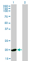 Western Blot analysis of HPCAL4 expression in transfected 293T cell line by HPCAL4 monoclonal antibody (M01), clone 2B11. Lane 1: HPCAL4 transfected lysate(22.2 KDa). Lane 2: Non-transfected lysate.