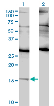 Western Blot analysis of ID2 expression in transfected 293T cell line by ID2 monoclonal antibody (M01), clone 3C3. Lane 1: ID2 transfected lysate(14.9 KDa). Lane 2: Non-transfected lysate.