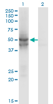 Western Blot analysis of IDH2 expression in transfected 293T cell line by IDH2 monoclonal antibody (M01), clone 5F11. Lane 1: IDH2 transfected lysate(50.9 KDa). Lane 2: Non-transfected lysate.