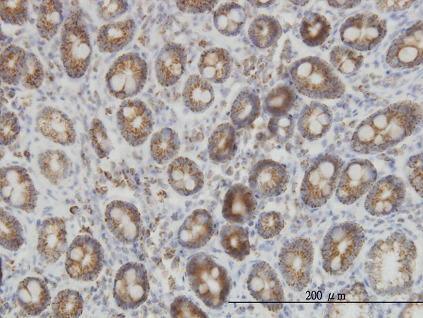 Immunoperoxidase of monoclonal antibody to IDH2 on formalin-fixed paraffin-embedded human colon. [antibody concentration 3 ug/ml] |