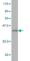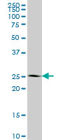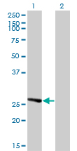 Western Blot analysis of IDI1 expression in transfected 293T cell line by IDI1 monoclonal antibody (M01), clone 6G10. Lane 1: IDI1 transfected lysate(26.5 KDa). Lane 2: Non-transfected lysate. |