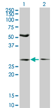 Western Blot analysis of IFT57 expression in transfected 293T cell line by IFT57 monoclonal antibody (M04), clone 3G4. Lane 1: IFT57 transfected lysate(27.069 KDa). Lane 2: Non-transfected lysate. |