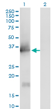 Western Blot analysis of IL1A expression in transfected 293T cell line by IL1A monoclonal antibody (M01), clone 4B8. Lane 1: IL1A transfected lysate(30.6 KDa). Lane 2: Non-transfected lysate.
