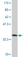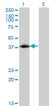 Western Blot analysis of ISL2 expression in transfected 293T cell line by ISL2 monoclonal antibody (M03), clone 1D9. Lane 1: ISL2 transfected lysate(39.8 KDa). Lane 2: Non-transfected lysate.