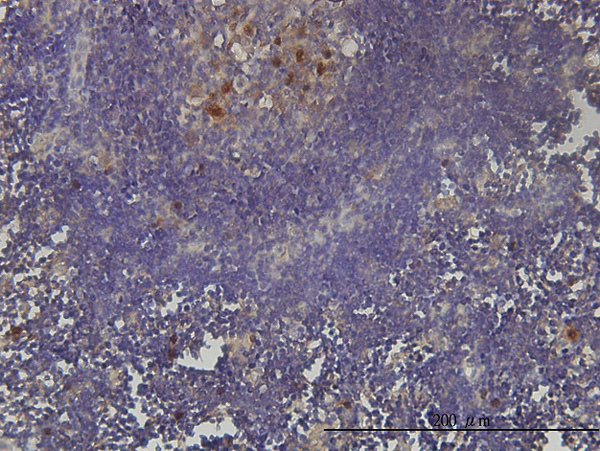 Immunoperoxidase of monoclonal antibody to KIAA0101 on formalin-fixed paraffin-embedded human lymph node tissue. [antibody concentration 3 ug/ml]