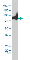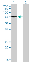Western Blot analysis of KIF2C expression in transfected 293T cell line by KIF2C monoclonal antibody (M01), clone 1G2. Lane 1: KIF2C transfected lysate(81.3 KDa). Lane 2: Non-transfected lysate. |