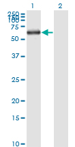 Western Blot analysis of KPNA1 expression in transfected 293T cell line by KPNA1 monoclonal antibody (M01), clone 2A4-1B5. Lane 1: KPNA1 transfected lysate(60.2 KDa). Lane 2: Non-transfected lysate. |