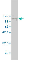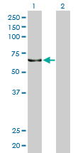Western Blot analysis of KPNA5 expression in transfected 293T cell line by KPNA5 monoclonal antibody (M01), clone 1D2. Lane 1: KPNA5 transfected lysate(60.7 KDa). Lane 2: Non-transfected lysate. |