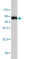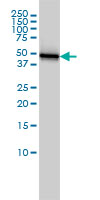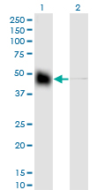 Western Blot analysis of KRT18 expression in transfected 293T cell line by KRT18 monoclonal antibody (M01), clone 2F8. Lane 1: KRT18 transfected lysate(48.1 KDa). Lane 2: Non-transfected lysate. |