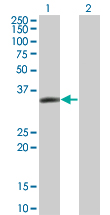 Western Blot analysis of LASP1 expression in transfected 293T cell line by LASP1 monoclonal antibody (M05), clone 4F5. Lane 1: LASP1 transfected lysate(29.7 KDa). Lane 2: Non-transfected lysate. |
