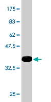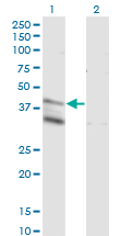 Western Blot analysis of LASS4 expression in transfected 293T cell line by LASS4 monoclonal antibody (M03), clone 7D5. Lane 1: LASS4 transfected lysate(46.4 KDa). Lane 2: Non-transfected lysate. |