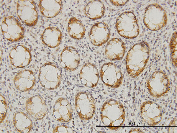 Immunoperoxidase of monoclonal antibody to LASS6 on formalin-fixed paraffin-embedded human colon. [antibody concentration 3 ug/ml] |