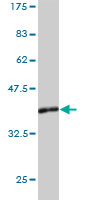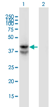 Western Blot analysis of LDHAL6B expression in transfected 293T cell line by LDHAL6B monoclonal antibody (M01), clone 1A3. Lane 1: LDHAL6B transfected lysate (Predicted MW: 42 KDa). Lane 2: Non-transfected lysate.