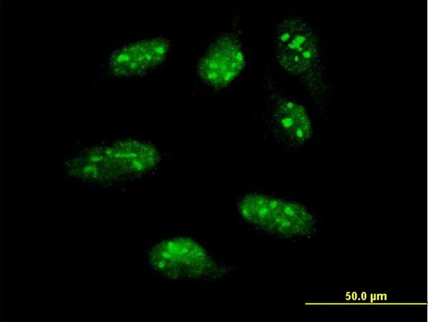 Immunofluorescence of monoclonal antibody to LHX1 on HeLa cell . [antibody concentration 10 ug/ml]