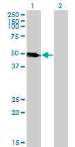 Western Blot analysis of LSP1 expression in transfected 293T cell line by LSP1 monoclonal antibody (M07), clone 1C4. Lane 1: LSP1 transfected lysate(37.2 KDa). Lane 2: Non-transfected lysate.