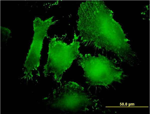 Immunofluorescence of monoclonal antibody to MAGI1 on HeLa cell. [antibody concentration 10 ug/ml] |