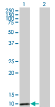 Western Blot analysis of MAPKSP1 expression in transfected 293T cell line by MAPKSP1 monoclonal antibody (M03), clone 2A4. Lane 1: MAPKSP1 transfected lysate(13.623 KDa). Lane 2: Non-transfected lysate. |