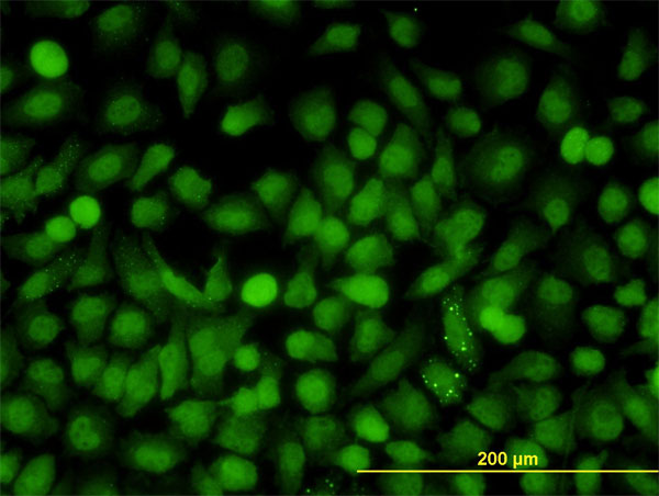 Immunofluorescence of monoclonal antibody to MAPK9 on HeLa cell. [antibody concentration 10 ug/ml] |