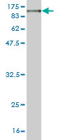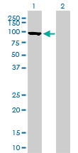 Western Blot analysis of MFN1 expression in transfected 293T cell line by MFN1 monoclonal antibody (M04), clone 3C9. Lane 1: MFN1 transfected lysate(84.2 KDa). Lane 2: Non-transfected lysate. |