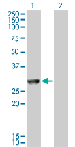 Western Blot analysis of MGC40579 expression in transfected 293T cell line by MGC40579 monoclonal antibody (M11), clone 2C11. Lane 1: MGC40579 transfected lysate(33.9 KDa). Lane 2: Non-transfected lysate.