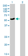 Western Blot analysis of MYOC expression in transfected 293T cell line by MYOC monoclonal antibody (M01), clone 4F8. Lane 1: MYOC transfected lysate(57 KDa). Lane 2: Non-transfected lysate.