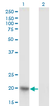 Western Blot analysis of NDUFAB1 expression in transfected 293T cell line by NDUFAB1 monoclonal antibody (M06), clone 2D10. Lane 1: NDUFAB1 transfected lysate (Predicted MW: 17.4 KDa). Lane 2: Non-transfected lysate.