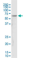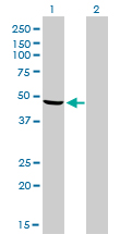 Western Blot analysis of NDUFV1 expression in transfected 293T cell line by NDUFV1 monoclonal antibody (M01), clone 4A7. Lane 1: NDUFV1 transfected lysate(50.8 KDa). Lane 2: Non-transfected lysate. |