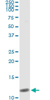 Western Blot analysis of NPPB expression in transfected 293T cell line by NPPB monoclonal antibody (M01), clone 2D11. Lane 1: NPPB transfected lysate(14.726 KDa). Lane 2: Non-transfected lysate.