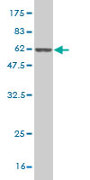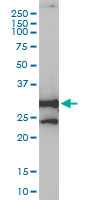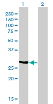 Western Blot analysis of NQO1 expression in transfected 293T cell line by NQO1 monoclonal antibody (M01), clone 1E3-A6. Lane 1: NQO1 transfected lysate(30.9 KDa). Lane 2: Non-transfected lysate. |