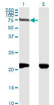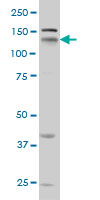 Western Blot analysis of NRP1 expression in transfected 293T cell line by NRP1 monoclonal antibody (M05), clone 1B3. Lane 1: NRP1 transfected lysate(68.3 KDa). Lane 2: Non-transfected lysate. |