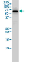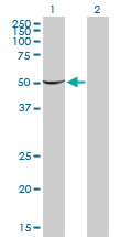 Western Blot analysis of PGM1 expression in transfected 293T cell line by PGM1 monoclonal antibody (M01), clone 3B8-H4. Lane 1: PGM1 transfected lysate(61.4 KDa). Lane 2: Non-transfected lysate. |