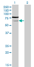 Western Blot analysis of PGM3 expression in transfected 293T cell line by PGM3 monoclonal antibody (M01), clone 1E2-1B12. Lane 1: PGM3 transfected lysate(59.9 KDa). Lane 2: Non-transfected lysate. |