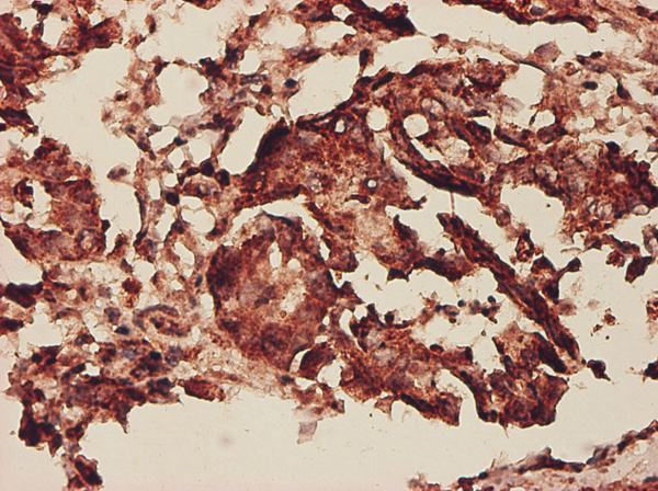 Immunoperoxidase of monoclonal antibody to PHB on formalin-fixed paraffin-embedded human colon adenocarcinoma. [antibody concentration 5 ug/ml] |