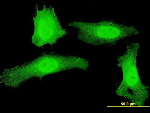 Immunofluorescence of monoclonal antibody to PLEKHG5 on HeLa cell . [antibody concentration 10 ug/ml] |