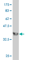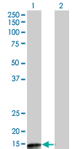 Western Blot analysis of PPP3R2 expression in transfected 293T cell line by PPP3R2 monoclonal antibody (M07), clone 5D9. Lane 1: PPP3R2 transfected lysate(19.9 KDa). Lane 2: Non-transfected lysate. |